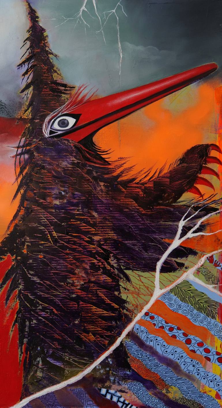 The critical situation of our planet has driven me to give as expressive a depiction of the current situation as possible. The decaying bird with its large beak is actually a tree - or is it an animal - bear - ? - that wants to call out into the world. The white branch is the symbol of the dying fo...