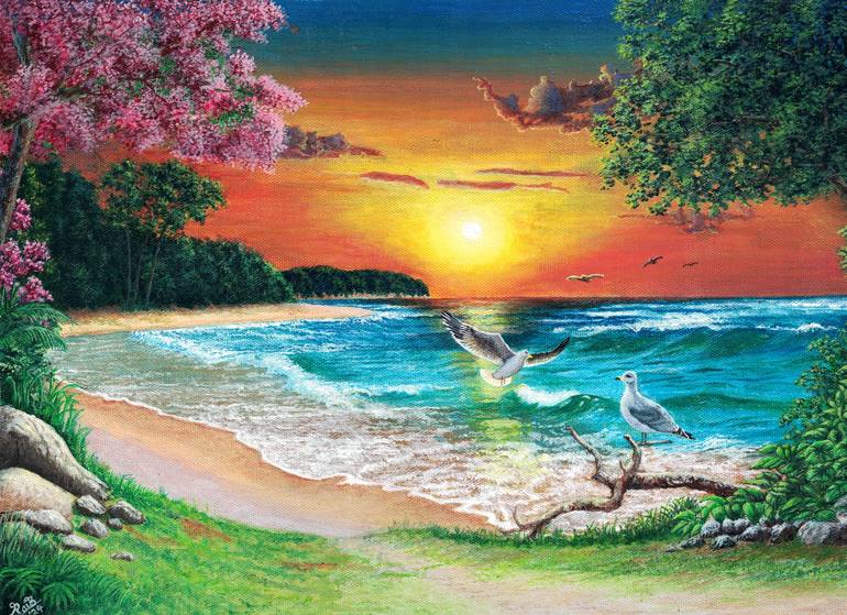 This painting is to give the viewers feeling of peace and joy. There's no need to rush, no expectations or demands—just the simple joy of being in the peaceful moment. The combination of the gentle waves, flying seagulls, and setting sun creates a feeling of harmony and balance in the natural world ...