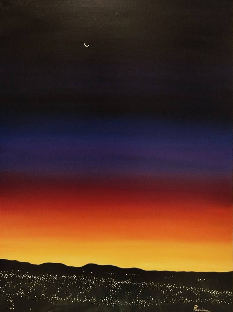 This painting depicts a vibrant and picturesque evening landscape. In the foreground, you can see the dark silhouettes of mountains outlined by a thin line of lights, symbolizing the city. The main focus is on the sky, which is filled with rich shades, transitioning from deep blue at the top to brig...