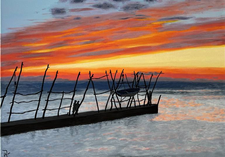 Colourful acrylic painting"Sunset in Savudrija" was inspired by romantic walk along Savudrija bay and enjojing colorful sunset from one of wooden cranes, named grue. Grue are tradictional accacia woden cranes, protected as ethnological heritage of Umag region in Croatia. Walkers on the pier with woo...
