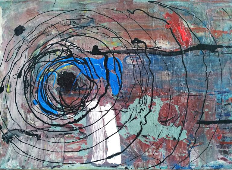 Description of the figurative composition: The canvas depicts the seascape during the sunset. It is structurally divided into two sectors. Іn the foreground we see black circles, which are depicted in the background of the sea sunset. The circles are thin, but they are getting wider closer to the c...