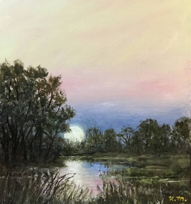 of SUPER MOON RISING ©2023 by me, K. McDermott Oil on 9.75X8.75 inch handmade canvas panel Comes ready to hang in an outrageously ornate upcycled gold wood frame in excellent condition Outside dimensions of the frame measure 13.75 X 12.75 inches and 1.75 inches deep - code 069