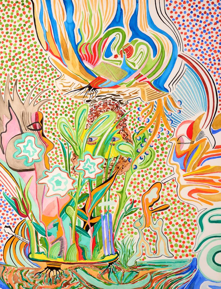 This is watercolors and ink with pen on paper. It is my abstract that I have make in the beginning of my career. Full with fantasy I use a lot experiments at this time with a lot of lines, small circles and points on the paper to have the shadows I want.