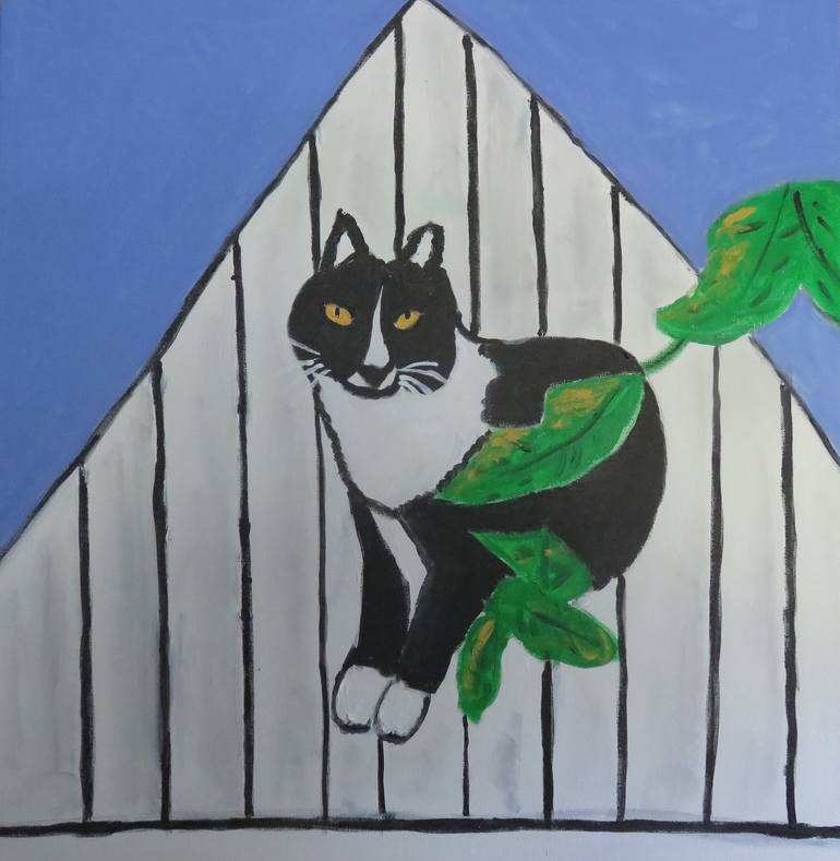 Sylvester is my muse. Nobody is more mellow on the roof. He likes to survey his realm below. I like his tuxedo blocks of color, which I then extended to the roof and the leaves. I purposely limited the color palette and chose bold acrylic color.
