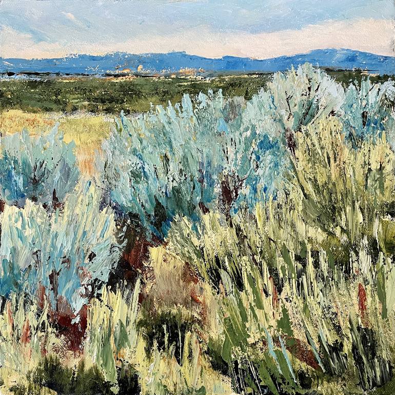 The American Southwest is dotted with hills blanketed in sagebrush, its vibrant bluish-green leaves standing out brilliantly against the light blue sky, with the gorgeous blue mountains seen in the distance. This piece is based on a scene in New Mexico, but it is a common site throughout the southw...