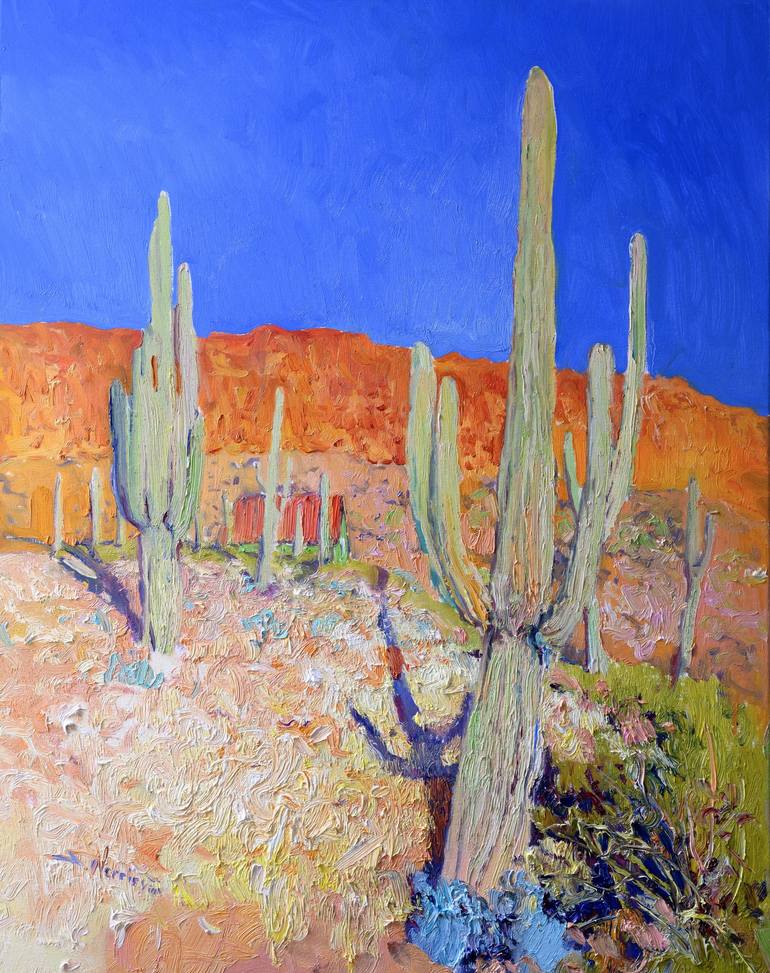 This work is from my series representing the beauty of Arizona Deserts. Unique shapes of DSaguaro Caucuses under the bright desert sun outlined with red rocks on the background together reflect the vibe and beautify of American Deserts. The artwork is on oil-primed linen, stretched on wooden bars. T...