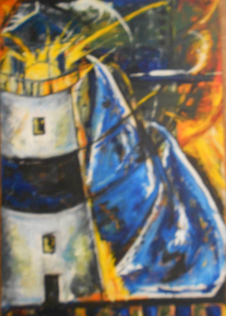 Sailing Races II is an oil painting on canvas. It is part of my Lighthouse Reflections series from 2008, where I took my fascination for light and reflection of light and used it to include sailboats and lighthouses done in an abstract expressionist form.