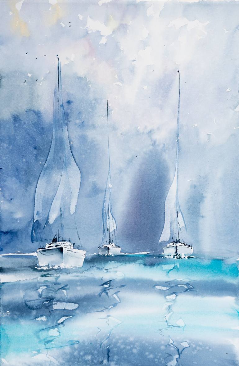 This watercolor painting depicts a seascape with boats, executed in a loose and light style. The color palette is dominated by shades of blue and green, creating a calming atmosphere. The composition is balanced, with the brushstrokes being loose and fluid, suggesting the movement of the waves and s...