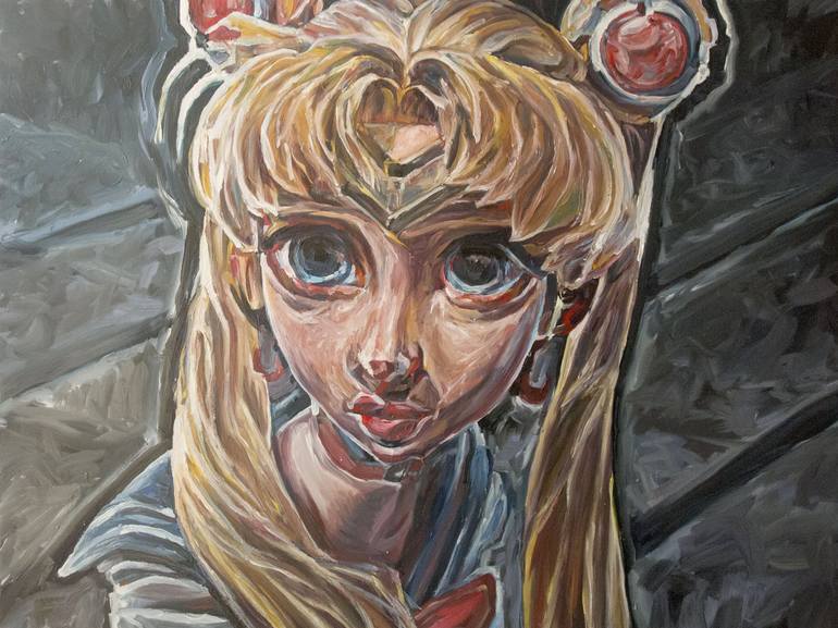 "Sailor Moon - Copycat" is a large portrait, rendered in oil on canvas. This original painting captures the essence of the iconic schoolgirl heroine from the beloved manga series, Sailor Moon. She is forever fighting to save the world. The artist's technique brings a modern and surreal edge to figu...