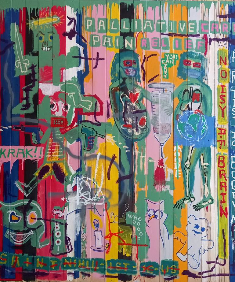 A tour de force painting on recycled wood. Acrylic, Oilstick, spraypaint, marker. Wildly contemporary and colourful, touching on themes of birth and childhood, beauty and danger. Edgy and beautiful, a strong image