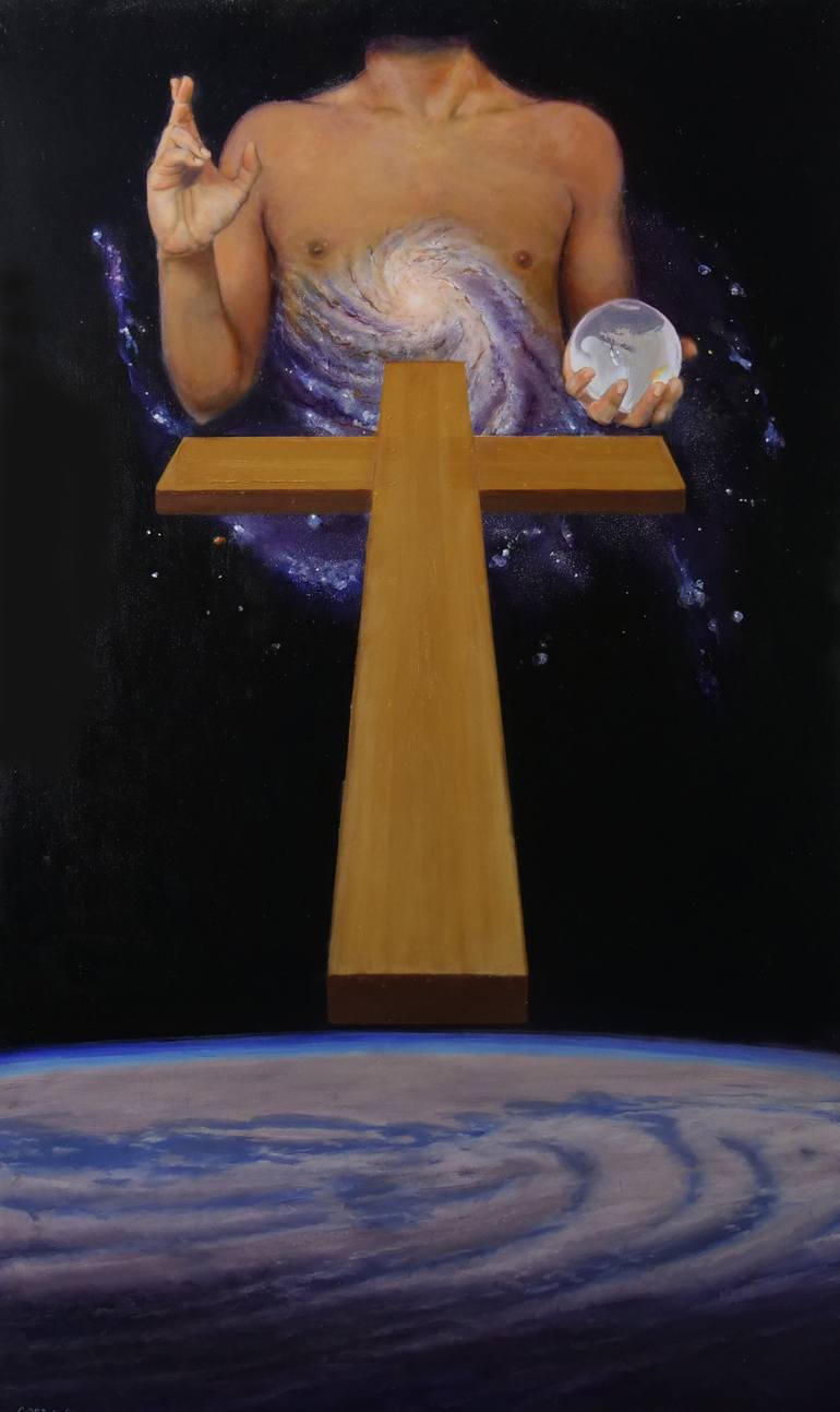 Salvator Mundi depicts Jesus Christ, the risen, sovereign Savior of the World. Leonardo's version is the most famous version, but there are numerous versions in the Western tradition. This one was inspired by Leonardo's painting, and also informed by the Christian paintings of Surealist painter Salv...