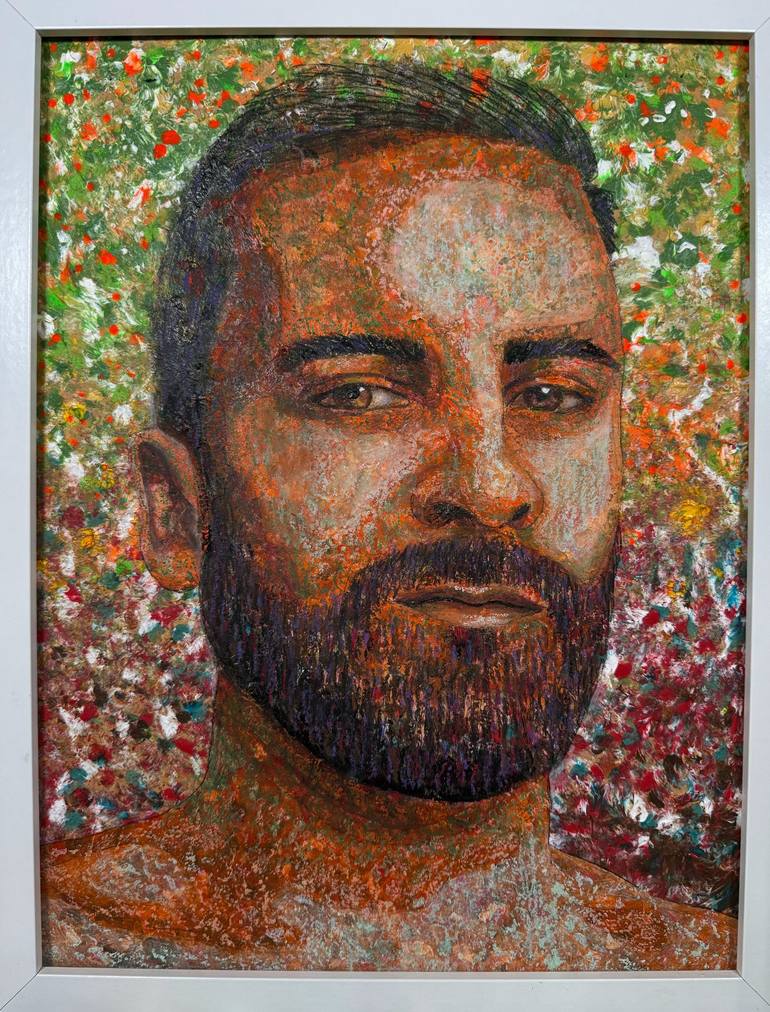 Acrylic and oil pastels on panel 33x43cm, with a white wooden frame ready to hang.