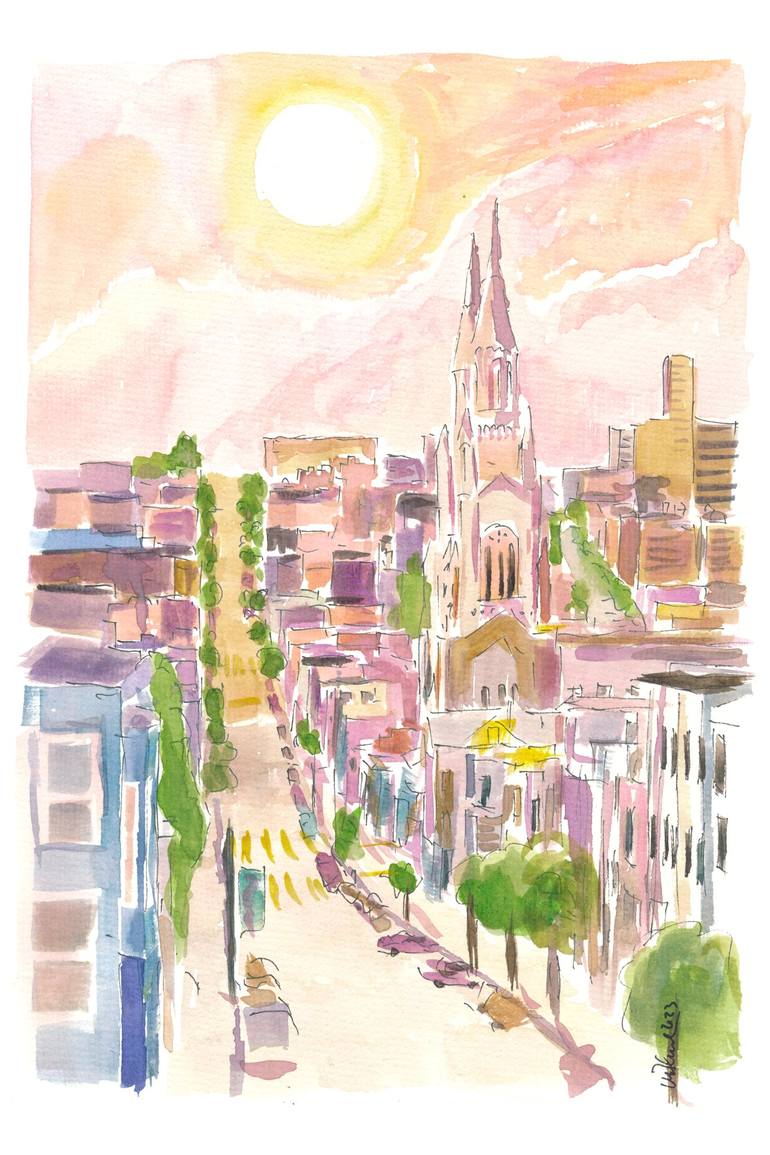 San Francisco Streets Hills and Sun Scene in California - watercolor on paper