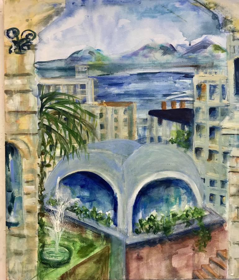 The painting was inspired by a trip to Alaska staying in San Fransisco for a while . The view was very inspirational and I made small studies to work up back in my studio in London. I loved the diverse architecture and the light a pls all oosphere of the city so paired a large version I acrylics.