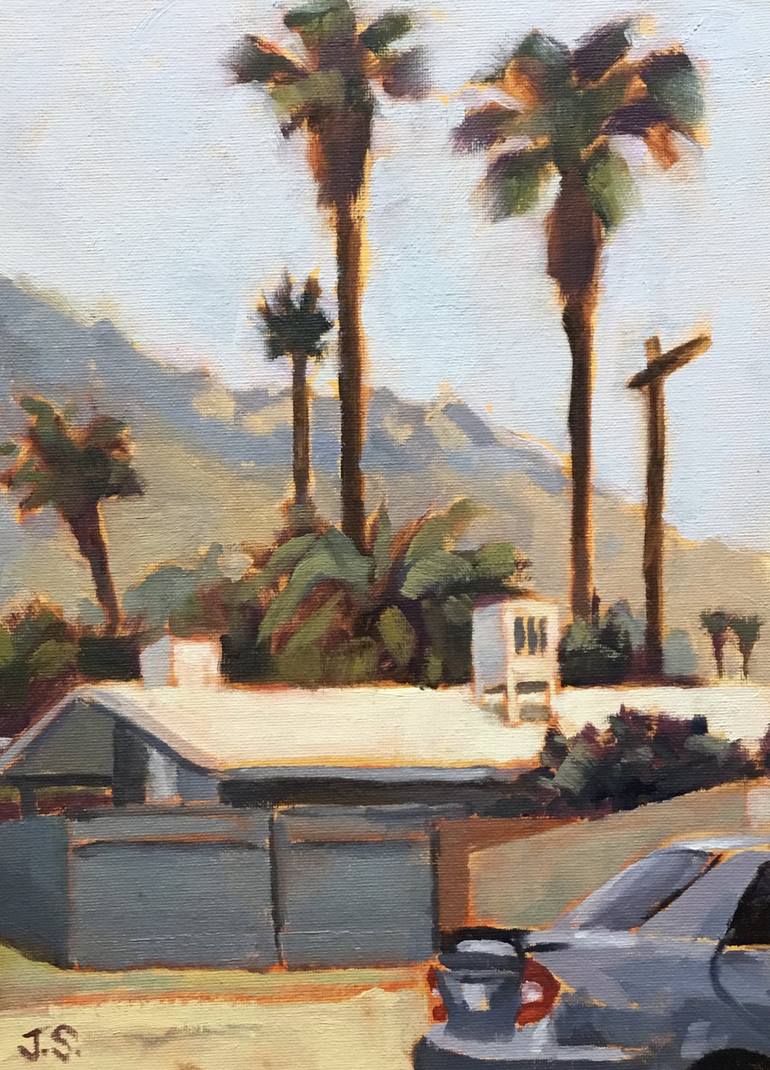 I painted this standing in the dead-end road in front of my house. It was very hot and the only way to paint outdoors was to get up before dawn, and set up my easel right out the door. It was a hazy morning. This is painted on archival canvas board, framed in a mahogany finished plein air frame, an...