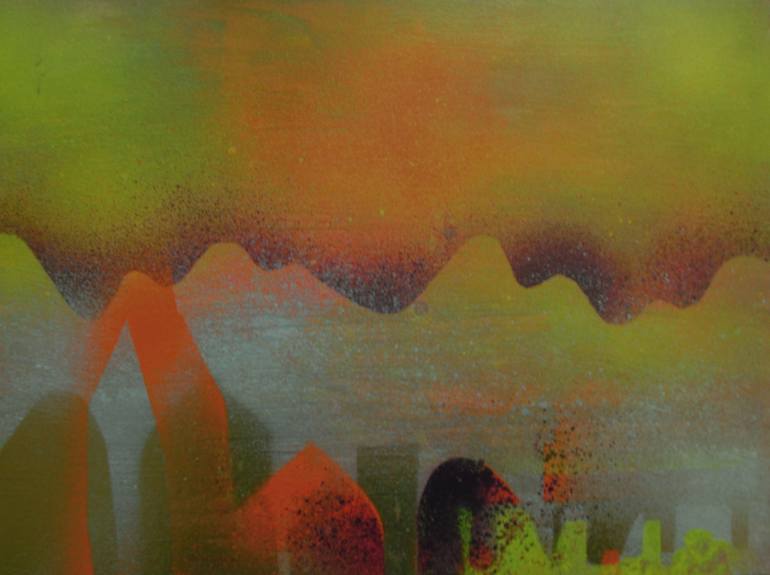 Cellulose spray paint on paper painting representing a morning mist composed of sand particles blown by the wind over the rooftops a desert city at sunrise.