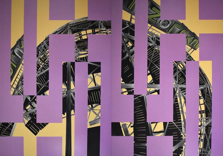 The image is the cyclone roller coaster on Coney Island in NYC. Arranged to look like a broken-down ship, this work is about the destructive force of massive hurricanes (cyclones) and our role in creating these storms through global warming. Named after hurricane Sandy.