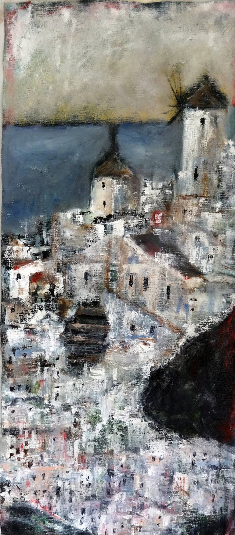 This abstract oil painting beautifully captures the essence of Santorini, one of the most iconic islands in Greece. The composition highlights the island's whitewashed buildings cascading down the cliffs, seamlessly blending with the deep blue of the Aegean Sea in the background. A windmill perched ...