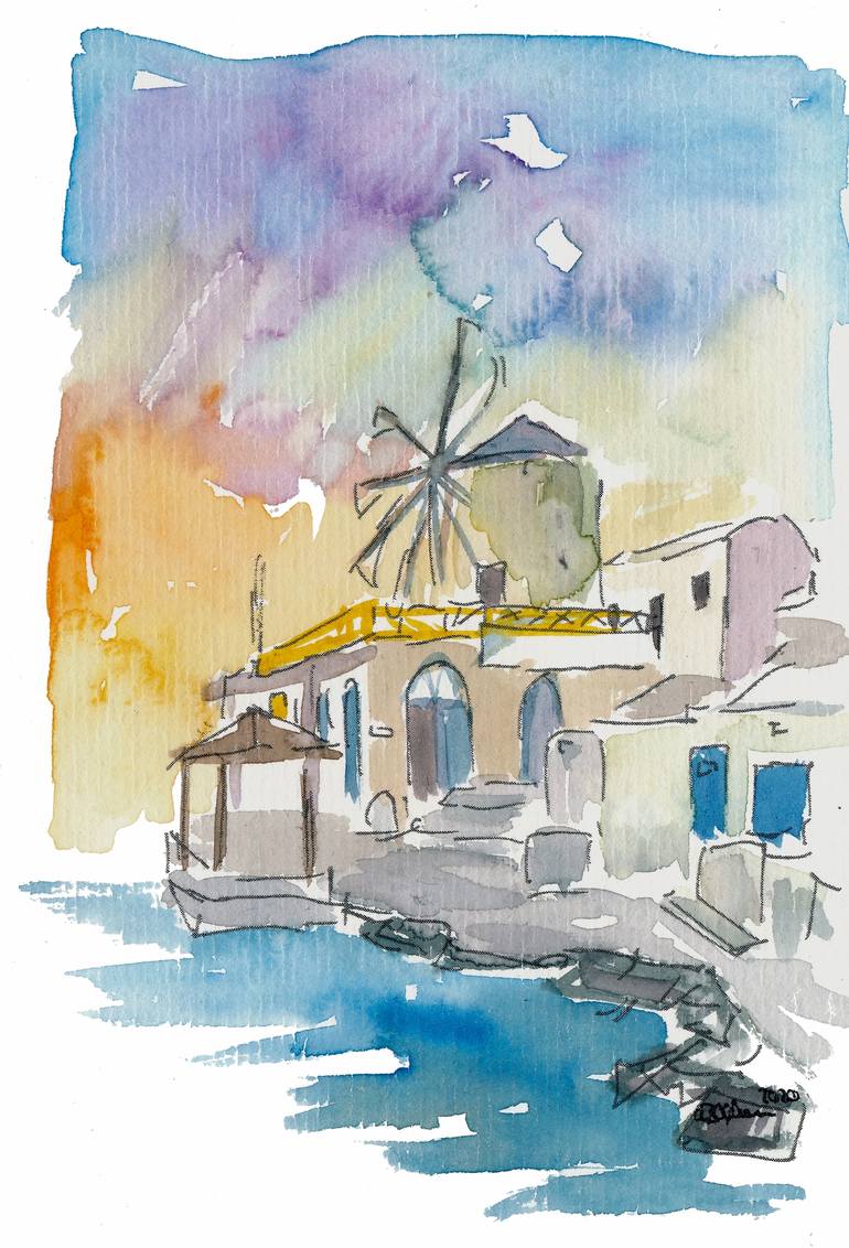 Santorini Therassia Lonely Island in Greece Watercolor on Paper Painting
