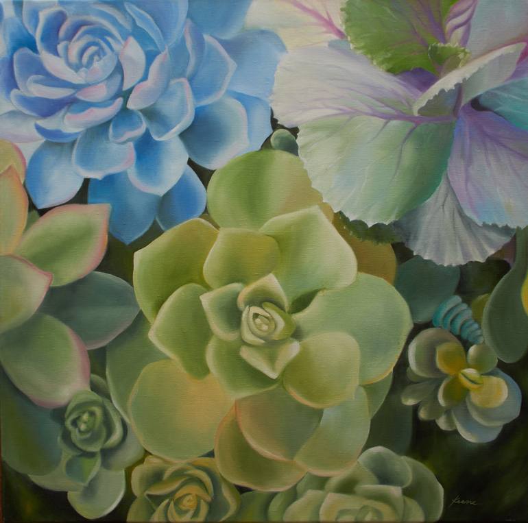 The more the merrier was my take on this abundance of succulents. I love to paint their “not just green” lobes. It is painted on all five sides, varnished and wired to hang.
