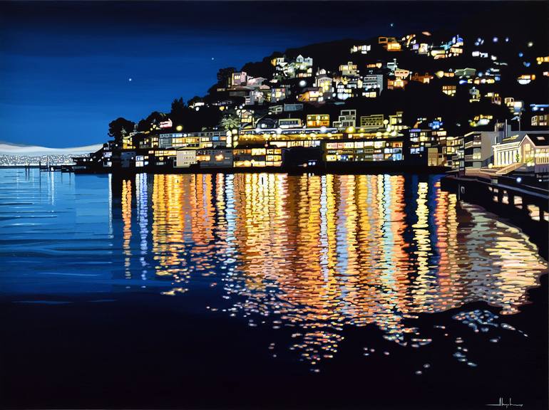 Alex Nizovsky – 'Sausalito Boardwalk View / Nocturne' (2025) Painting from 'Sausalito Reflections' Series. Style: Hyperrealism / Pop Art / Abstracted Landscape. Original Contemporary Art by Alex Nizovsky, Sausalito, California. Size: 40" x 30" x 3/4" (101 x 76 x 2 cm). Media: Acrylic on Canvas. ...