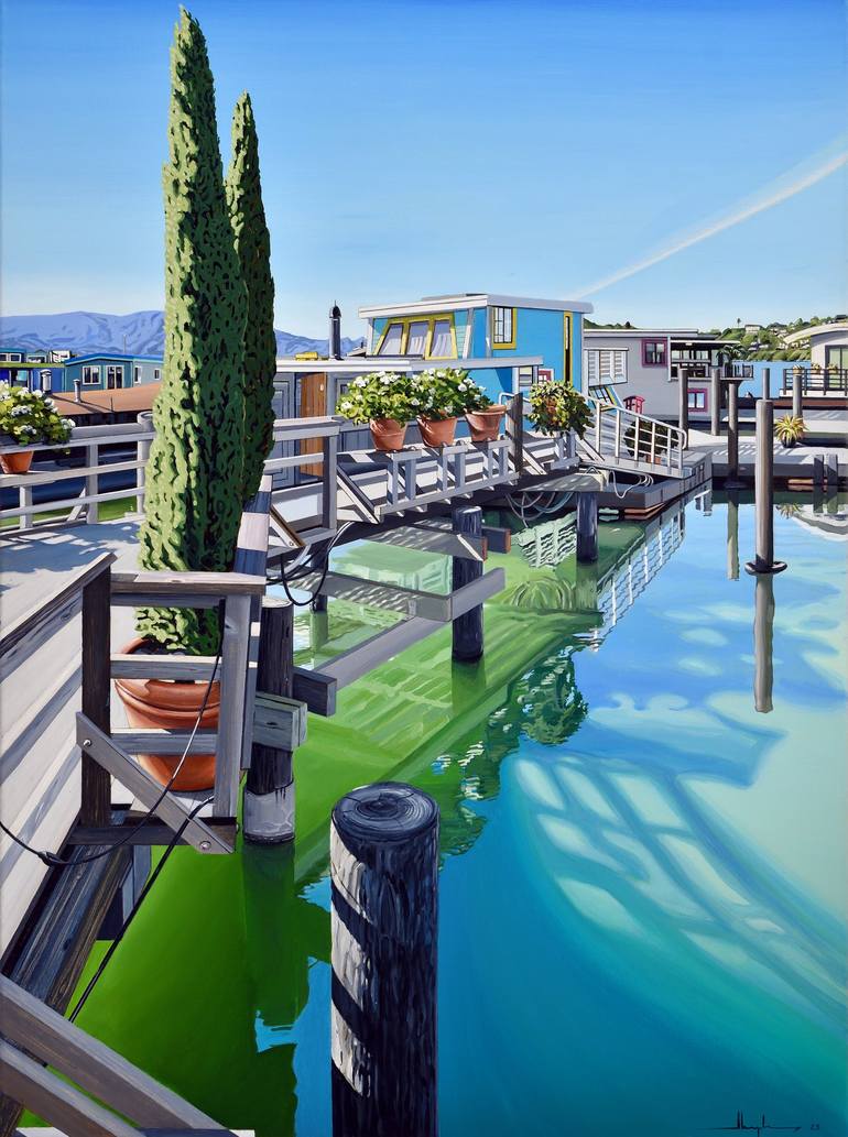 Alex Nizovsky – 'Sausalito Houseboats / Bridge Between Docks' (2023) Painting from 'Sausalito Reflections' Series. Style: Neo Realism / Pop Art / Abstracted Landscape. Inspired by works of David Hockney and Jonas Wood. Original Contemporary Art by Alex Nizovsky, Sausalito, California. Size: 40" x ...