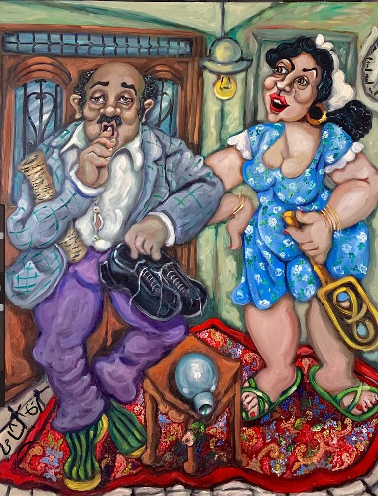 Sarcastic Egyptian folklore, oil painting, storytelling : the painting describes a husband who stays out late and strict wife who sets the household rules . If the husband breaks these rules ,the wife punishes him by beating him. This type of artwork may be inspired by satire or social community on ...