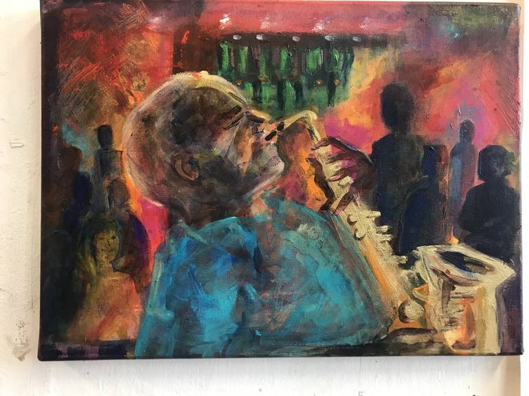 The work e was inspired by a musician playing in a small cellar club , the atmosphere was very good. I was drawing in situ which helps creating the atmosphere in the venue. I made small studies then worked the painting up in my studio using acrylics both transparent and opaque. The piece is on a str...