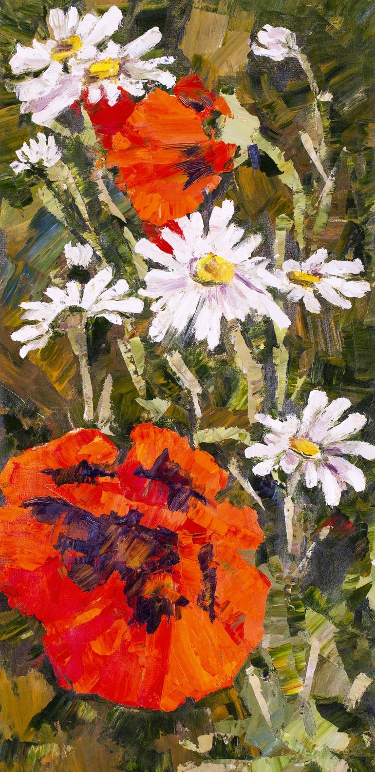 Scarlet Poppy is a pictorial work of art. I was delighted by the blooming scarlet poppy framed by white daisies. The painting was painted from nature, in the summer garden, in the style of impressionism. The work was done on high-quality linen canvas, oil paints of the English company "Winsor & N...
