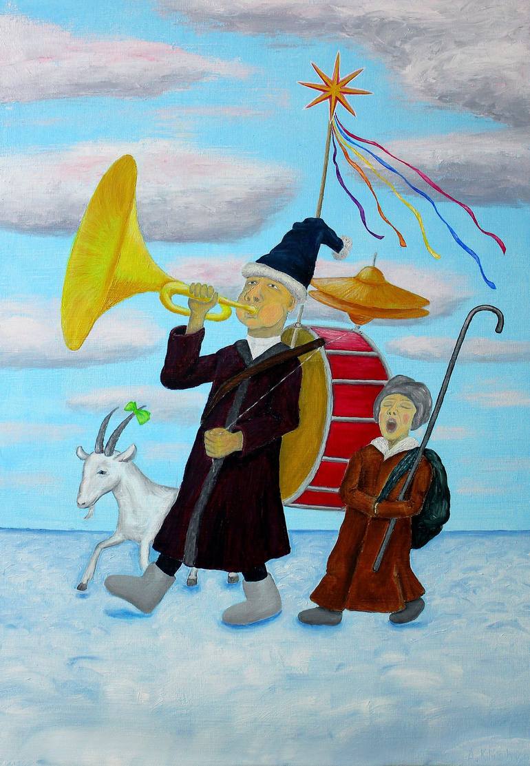 Fantasy on a Christmas theme. The festive musicians are walking, and with their music and singing, they bring the good news and disperse the clouds.