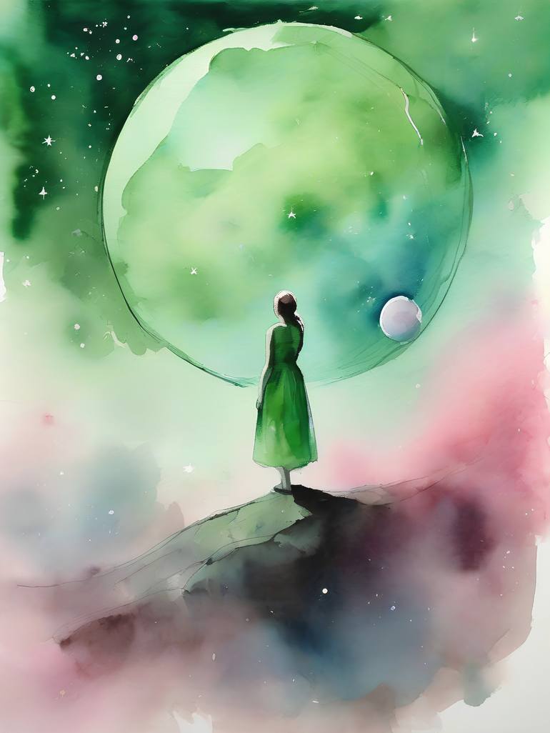Scenery with human figure The symbolic magic of the fictional landscape. Symbolism of pink and green. Dreaming nature.