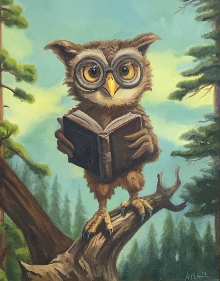 A captivating fantasy oil painting that transports viewers to a realm where wisdom and nature harmoniously converge. At the center of this enchanting scene perches a majestic owl, its sunlit feathers radiating an aura of ancient knowledge. The painting evokes a sense of quiet reverence, inviting vie...