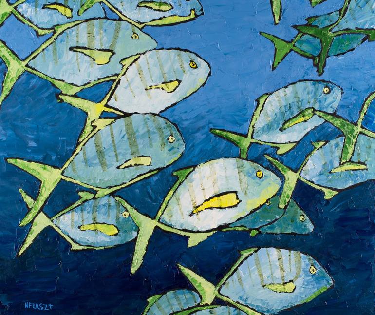 School of fish painted on custom cradled wood panel.