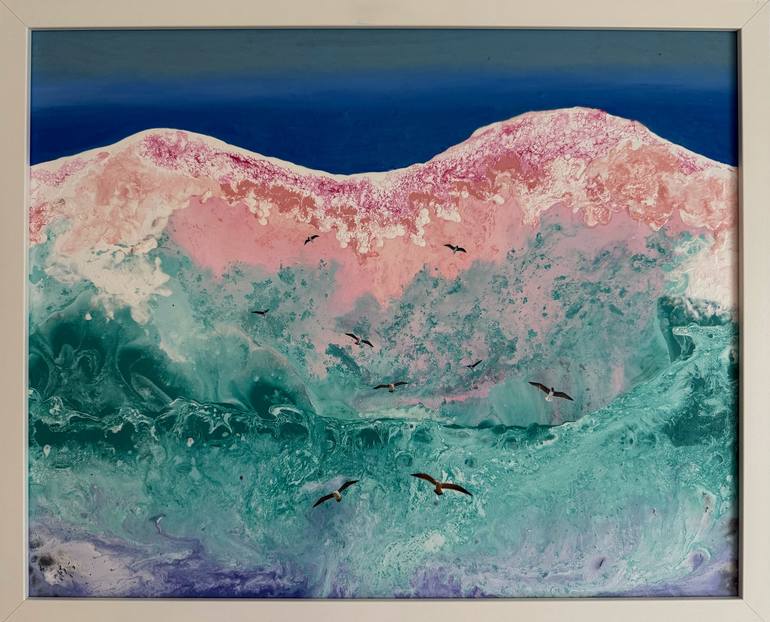The Italian word "sconfinare" means to go beyond familiar boundaries, to cross over. It conveys the idea of stepping outside one’s comfort zone, venturing into something new and unknown, exploring uncharted waters of the mind. Acrylic, oil and collage on panel with a white wooden frame, 52x42x3 and...