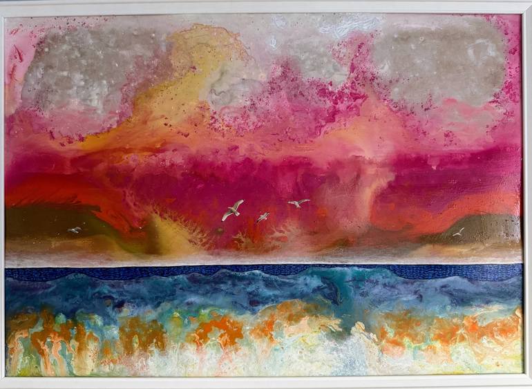 The Italian word "sconfinare" means to go beyond familiar boundaries, to cross over. It conveys the idea of stepping outside one’s comfort zone, venturing into something new and unknown, exploring uncharted waters of the mind. Acrylic, oil and collage on panel with a white wooden frame, 72x52x2cm a...