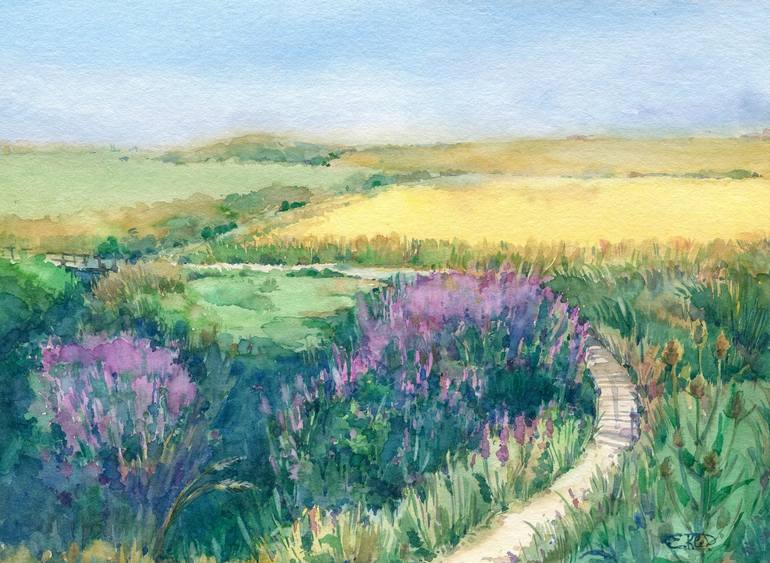 A Scottish landscape on a sunny summer day with fields of heather and other greenery. In the background is a wheat field Original watercolor painting of Scottish summer landscape with wheat and heather fields, Scotland. Painted on high quality 300 gsm watercolor paper. Unframed. Certificate of A...