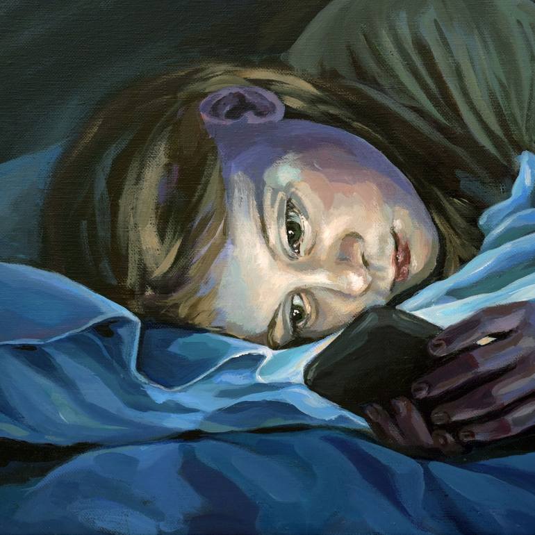 This portrait of a young girl conveys the impact of social isolation on children. It captures a moment when a young girl is left with what emerges on her phone screen. The blue light and shadows are a metaphor for sadness, loneliness, and void in her immediate environment. The dark outline of the ph...