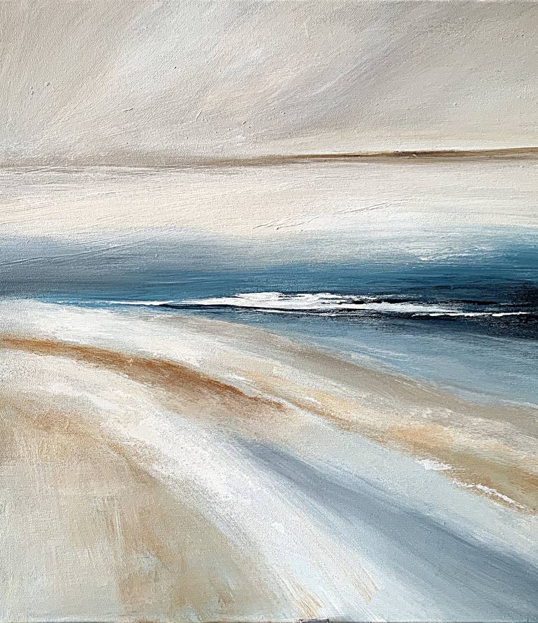Sea Horizon is an abstract painting in warm beige and sandy tones, with touches of gray, indigo, and blue. The artwork depicts a sea horizon where colors blend smoothly, creating a sense of tranquility and serenity. The minimalist approach to the composition highlights the grandeur of nature and e...