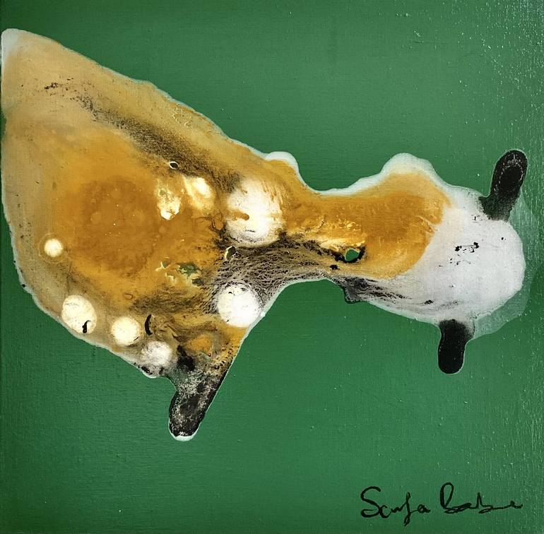 A female British artist from Nottingham born in August 1975, now residing in the Corbieres boondocks of the South of France. In her paintings she mainly concentrates on abstract naive hominoid forms and pure abstract forms, and likes to deviate from convention, playing with concepts, colours, shape and space. A lot of her work is based around the ideas of otherworldly, other dimension, energy, and space. Her inspiration comes from ancient history, mythology and mysticism, and a dream diary which she has kept since the age of 16 but also details dreams she can remember from her childhood. She uses mixed mediums such as acrylic paint, decorators paint, pens, and sometimes textures the canvass with paper and multiple paint layering. You will notice a lot of the beings in her work are portrayed without faces and the forms are simplified to demonstrate a sense of alternate dimension where matter isn’t completely formed or seen in the same way you and I see the world around us. This also conveys that in this realm identity isn’t terribly important as forms and characters can often mutate into something else. Historical artists that have inspired her are from the Surrealist movement such as: René Magritte, another artist who also famously did not portray faces; Gustav Klimt from the Art Nouveau movement but with surreal undertones; and Salvador Dali.