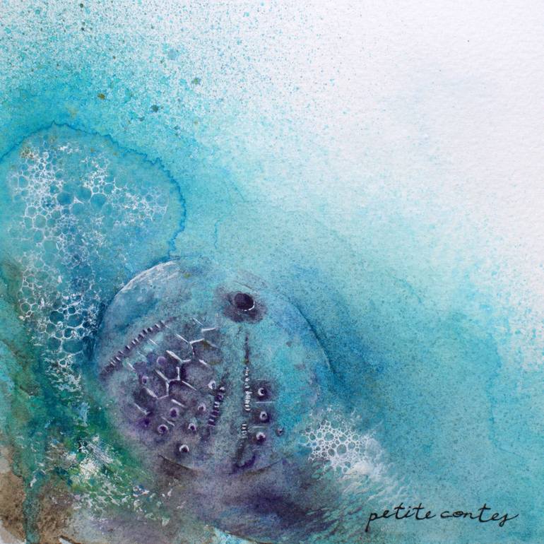 A delicate sea urchin shell rests peacefully on the ocean seabed, now home to another sea creature. Bubbles rise gently around the textured shell, evoking the quiet rhythm of underwater life. This piece, painted with Daniel Smith Primatek pigments, captures the serene beauty of marine life in an abs...