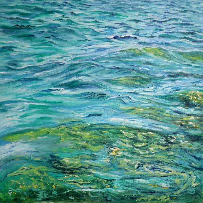 Green Sea Water Original Painting Size: 40 x 40 cm/ 16" x 16" Date: 2023 Materials: stretched canvas, oil paints, varnish. The artwork is signed and varnished. This painting can be placed both horizontally and vertically, as you prefer. This artwork is a good idea to give a touch of Italian modern...
