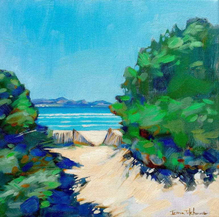 This picture was drawn by me from a sketch that I painted on the beach near my house. This beautiful place is surrounded by a pine forest, passing through which you find a path to the sea between evergreen bushes. I wanted the heat of the sand and the fresh sea breeze to emanate from the painting. A...