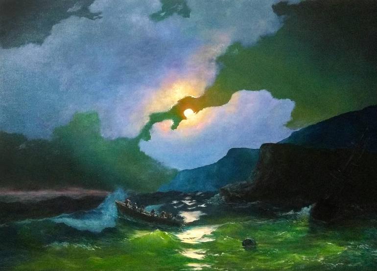 This painting is about feelings. I wanted to convey a fantastic atmosphere where there is infinity in the sky and hope in the sea. This work was inspired by the artist Aivazovsky