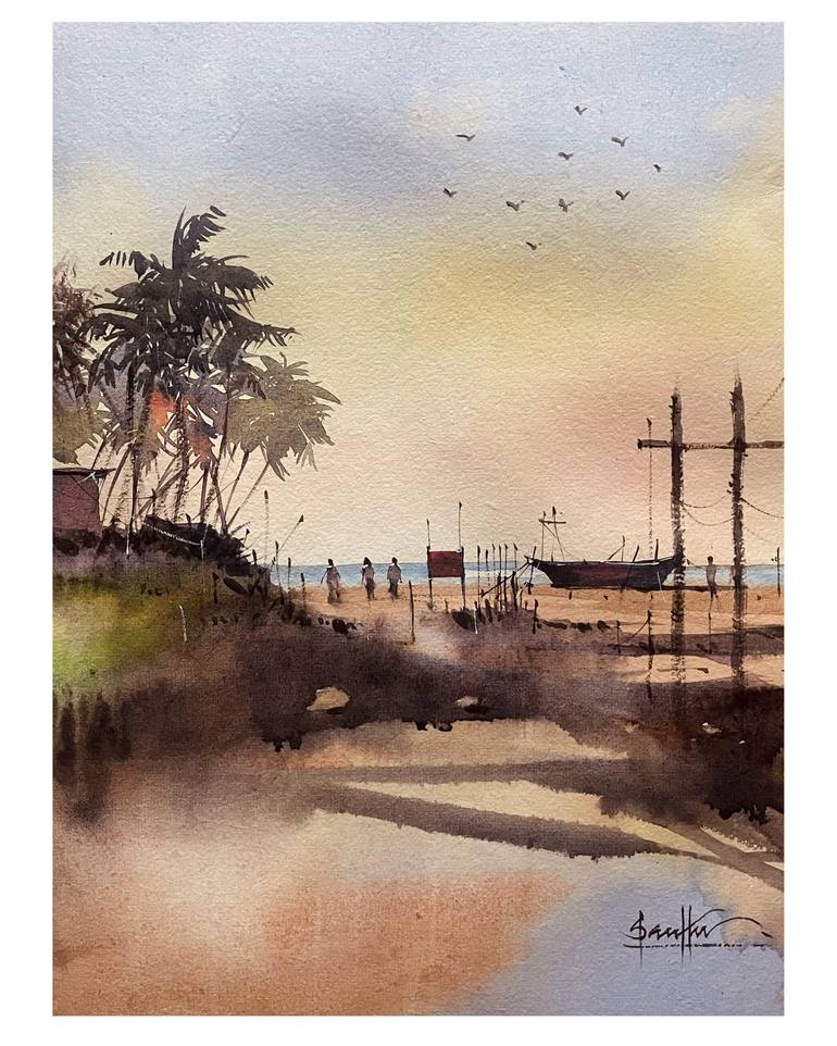 Beach is my favorite subject.because I love the whispering of the sea .this is watercolor painting on handmade paper. This is a picture drawn after a gap of some time. The small dilapidated house on the beach inspired me to paint this picture.