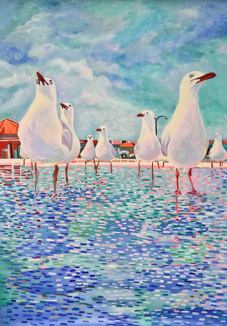 A group of seagulls stands on a reflective surface, surrounded by a vibrant sky and colorful patterns on the ground. The scene conveys a whimsical and lively atmosphere with the birds appearing to be almost animated as they gaze in different directions.