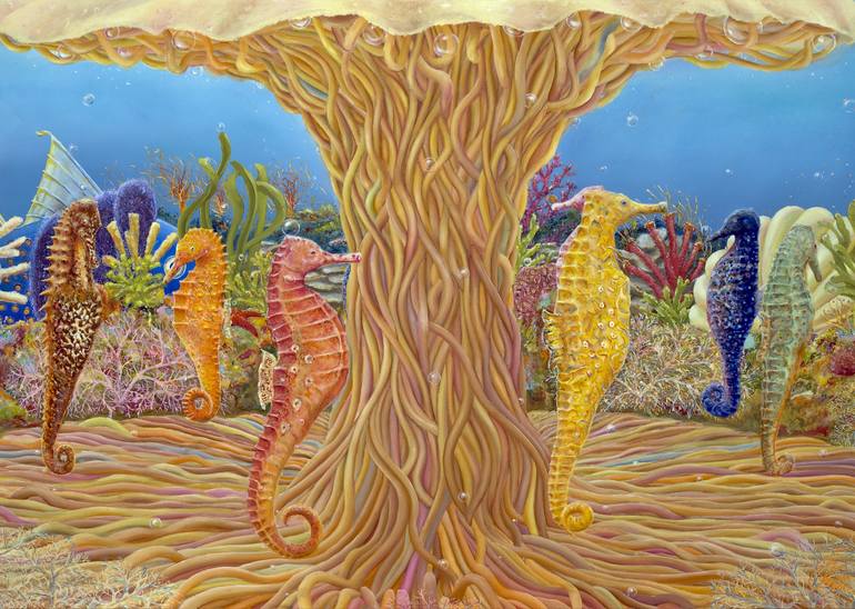 Painting: Oil on Canvas. The theme is based on a fun fair, something that brings back happy memories for many of us. Only, this is in another world, under the waves which can be fun as well. I thought of using the attractive seahorses bopping around in the same manner as we use the figures on a rea...