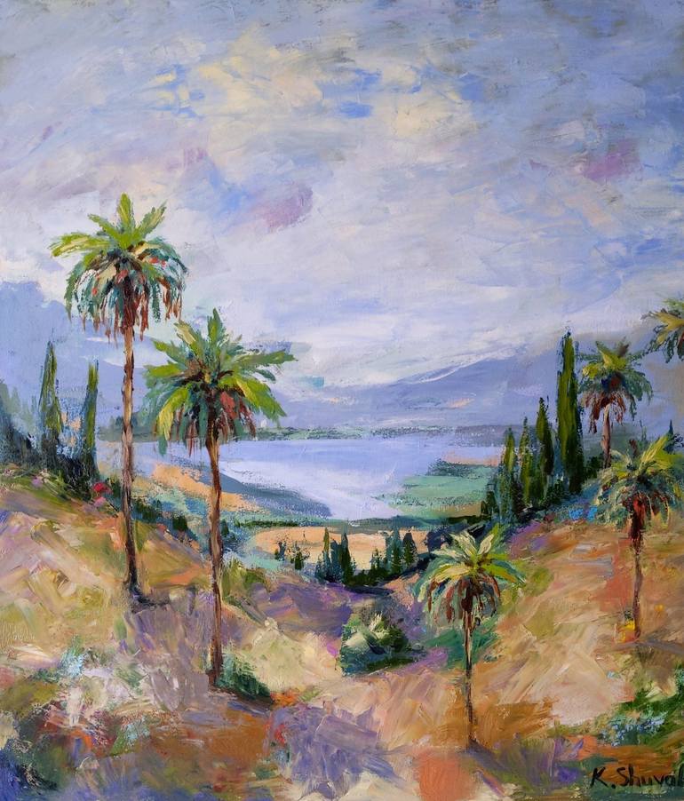 The painting depicts a sultry valley between the mountains and the sea, and majestic palm trees as a symbol of resilience and grandeur.