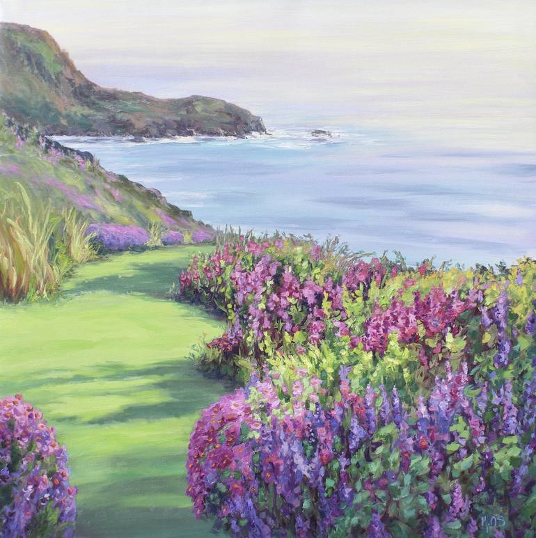 An original seascape and garden landscape painting in the most gorgeous colors of violets, greens and soft grays. This painting shows the garden and distant cliffs basking in warm sunshine, the air is misty and soft. The path through the grass leads you to the view of the ocean. This painting comes ...