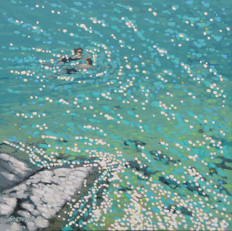 Seaswim is an image of a couple enjoying a seaswim in the sea at by local beach here in Fowey, Cornwall.