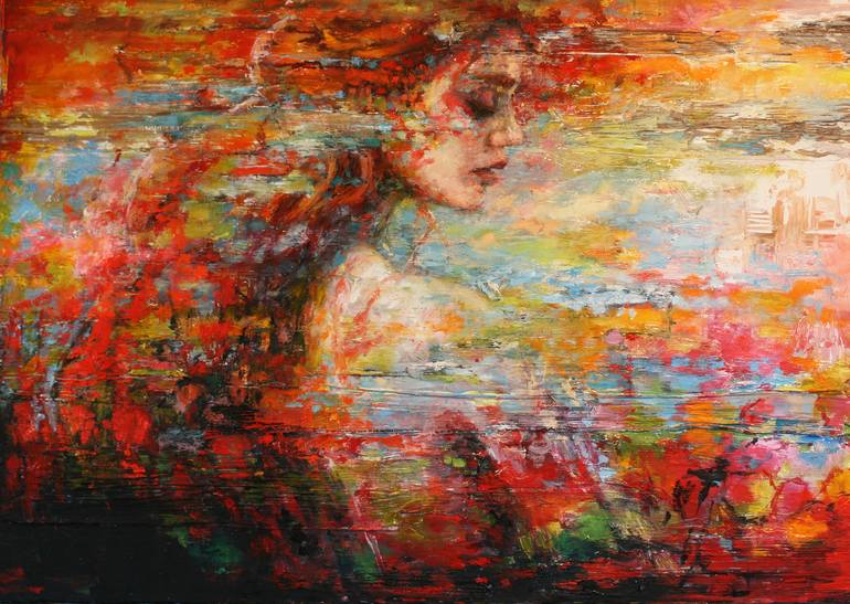 Very romantic, this young woman painted in oil. Looks like she's enjoying the garden. The contrast of the rugged background made of thick gesso and dried bananaleaves and the tenderly painted portrait makes this artwork very special. . This painting is full of beautiful details. It can be an eyecat...